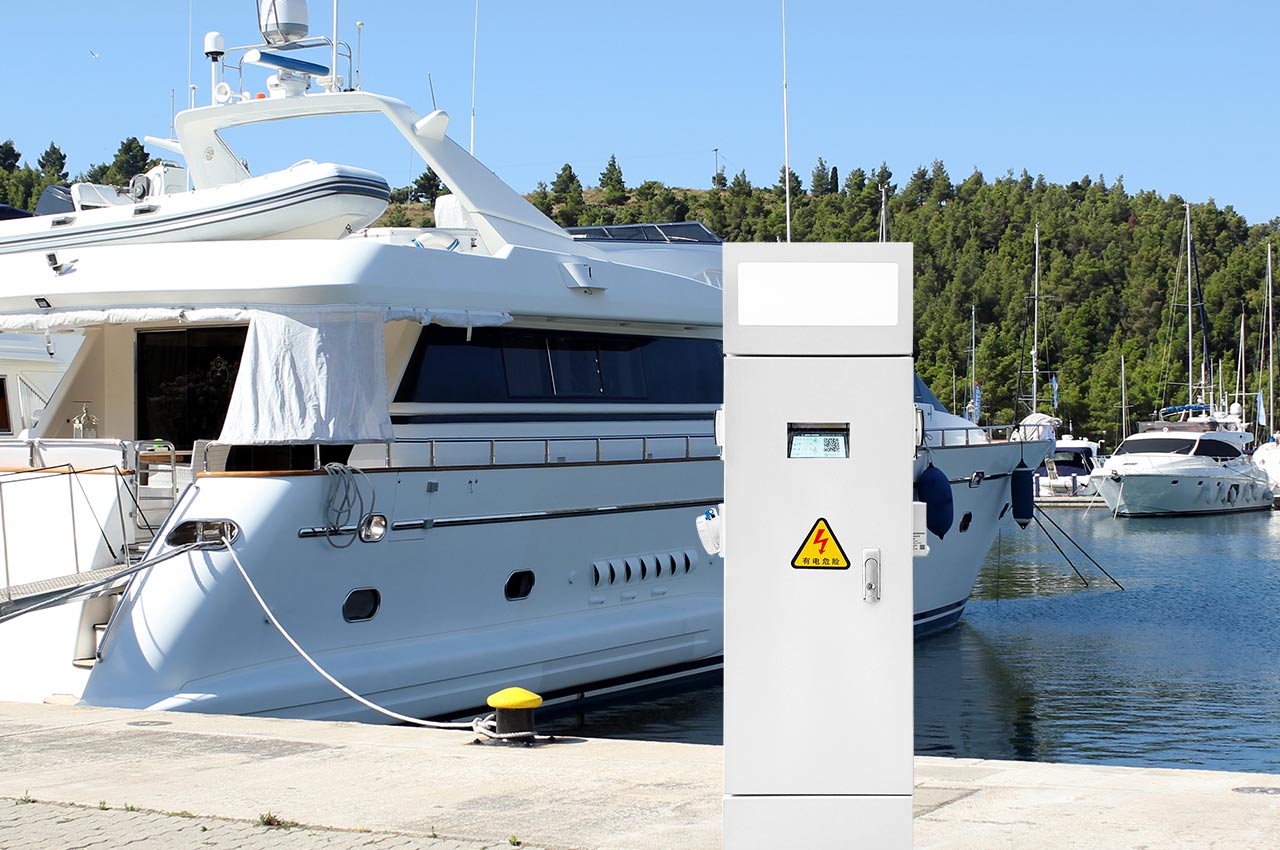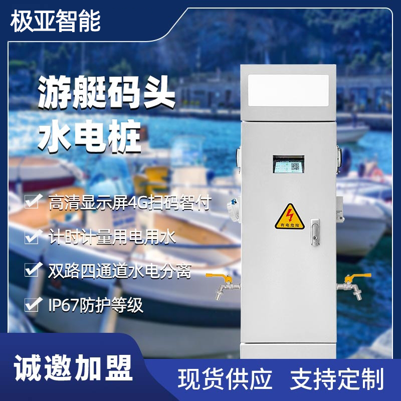 游艇码头水电桩GRWE1003020D-R-2A。桩体采用304不锈钢,插座采用IP67工业插座+IP54国标插座(支持换配),内置自主研发智付模块,自带高清显示屏,支持水电分离控制智付扫码。
